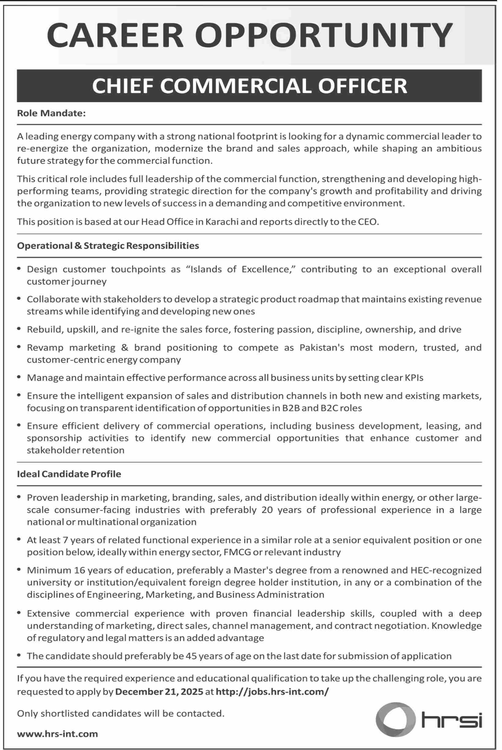 Both Male and Female candidates can apply for these Energy Company Jobs who have the Qualification: Design customer touchpoints as “Islands of Excellence,” contributing to an exceptional overall customer journey Collaborate with stakeholders to develop a strategic product roadmap that maintains existing revenue streams while identifying and developing new ones Rebuild, upskill, and re-ignite the sales force, fostering passion, discipline, ownership, and drive Revamp marketing & brand positioning to compete as Pakistan’s most modern, trusted, and customer-centric energy company Manage and maintain effective performance across all business units by setting clear KPIs Ensure the intelligent expansion of sales and distribution channels in both new and existing markets, focusing on transparent identification of opportunities in B2B and B2C roles Ensure efficient delivery of commercial operations, including business development, leasing, and sponsorship activities to identify new commercial opportunities that enhance customer and stakeholder retention, and many more experienced candidates should apply before 21 December 2025.