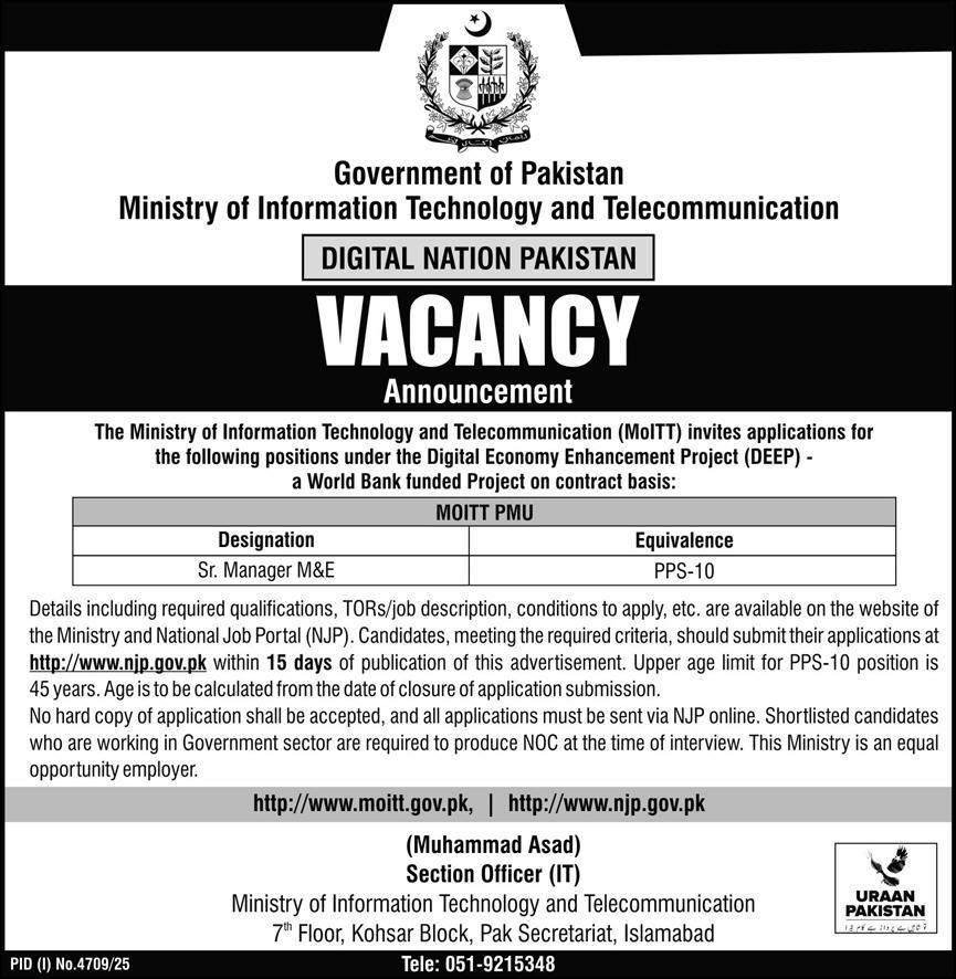 Candidates, if you are seeking Ministry of Information Technology and Telecommunication Jobs 2025, yes. Then it would help if you tried to complete the Ministry of Information Technology and Telecommunication Jobs because here you can easily apply for these vacancies: Sr. Manager M and E.