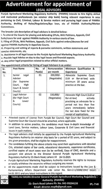 Candidates, if you are seeking Punjab Agricultural Marketing Regulatory Authority Jobs 2025, yes. Then it would help if you tried to complete this Punjab Agricultural Marketing Regulatory Authority Job because here you can easily apply for these vacancies: Senior Legal Advisor (for Supreme Court, High Court & Lower Courts), Legal Advisor (for High Court- Lower & Courts).