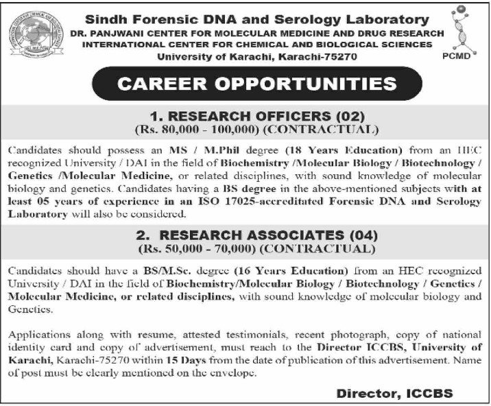 Candidates, if you are seeking Sindh Forensic DNA and Serology Laboratory Jobs 2025 in Karachi, yes. Then it would help if you tried to complete the Sindh Forensic DNA and Serology Laboratory Jobs because here you can easily apply for these vacancies: Research Officers and Research Associates.